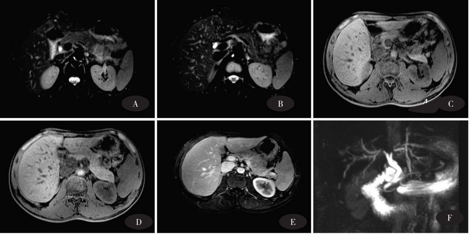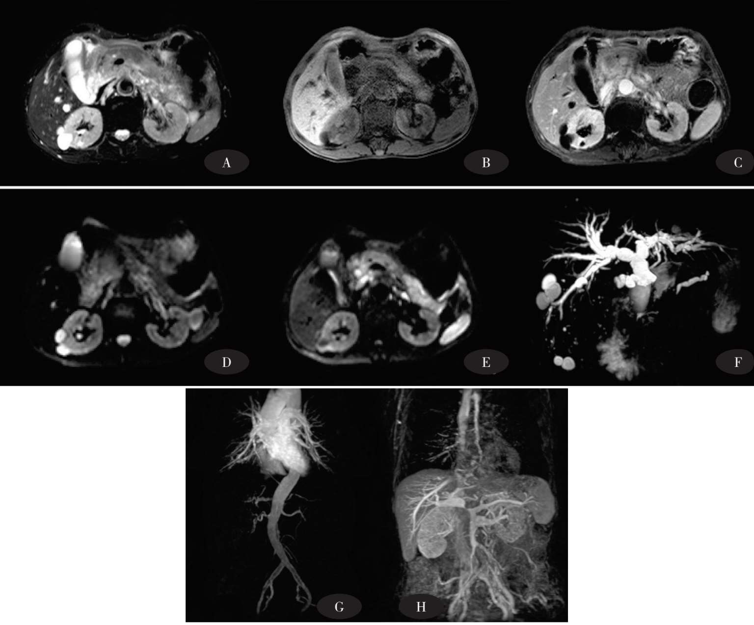 图8-5 胰头癌MRI平扫+增强+DWI+MRCP+MRA