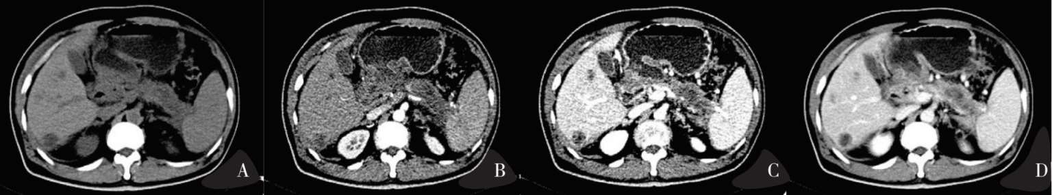 图8-3显示肝内转移。图8-3A平扫期:肝内转移灶呈低密度;图8-3B动脉期:病灶中央强化不明显,边缘似呈轻度环形强化;图8-3C、图8-3D门静脉期+延迟期:肝实质明显强化,与肝内转移灶密度产生明显对比。