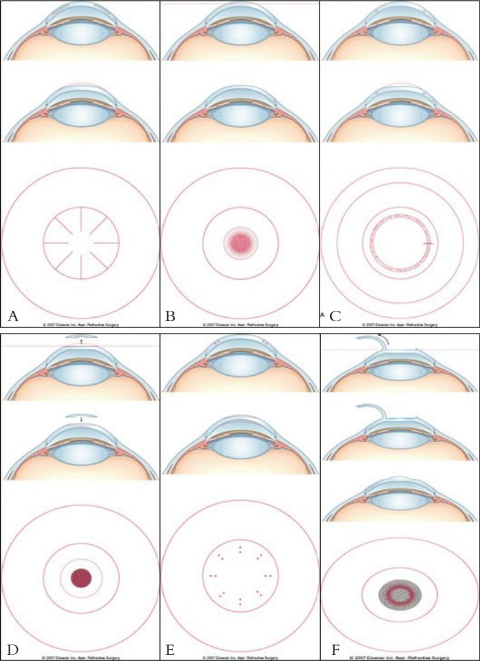 A.放射状角膜切开术(RK);B.准分子激光屈光性角膜切削术(PRK);C.角膜基质内环植入术(ICR或ICRS);D.准分子激光角膜上皮下磨镶术(LASEK);E.激光角膜热成形术(LTK);F.准分子激光原位角膜磨镶术(LASIK)