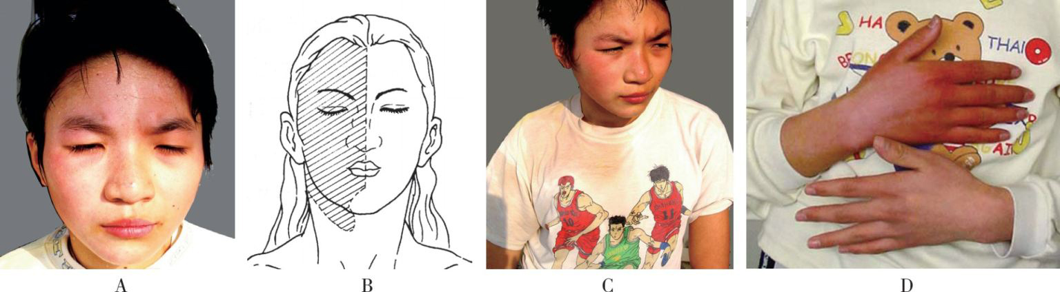 A. 右半侧面部及胸部多汗,右手指发绀、右眼结膜充血。B. 斜线部位为右侧面部多汗区。C. 右胸部衣服被汗湿,左侧正常。D. 右手皮肤颜色变红、发绀、脉搏细弱;左手正常。