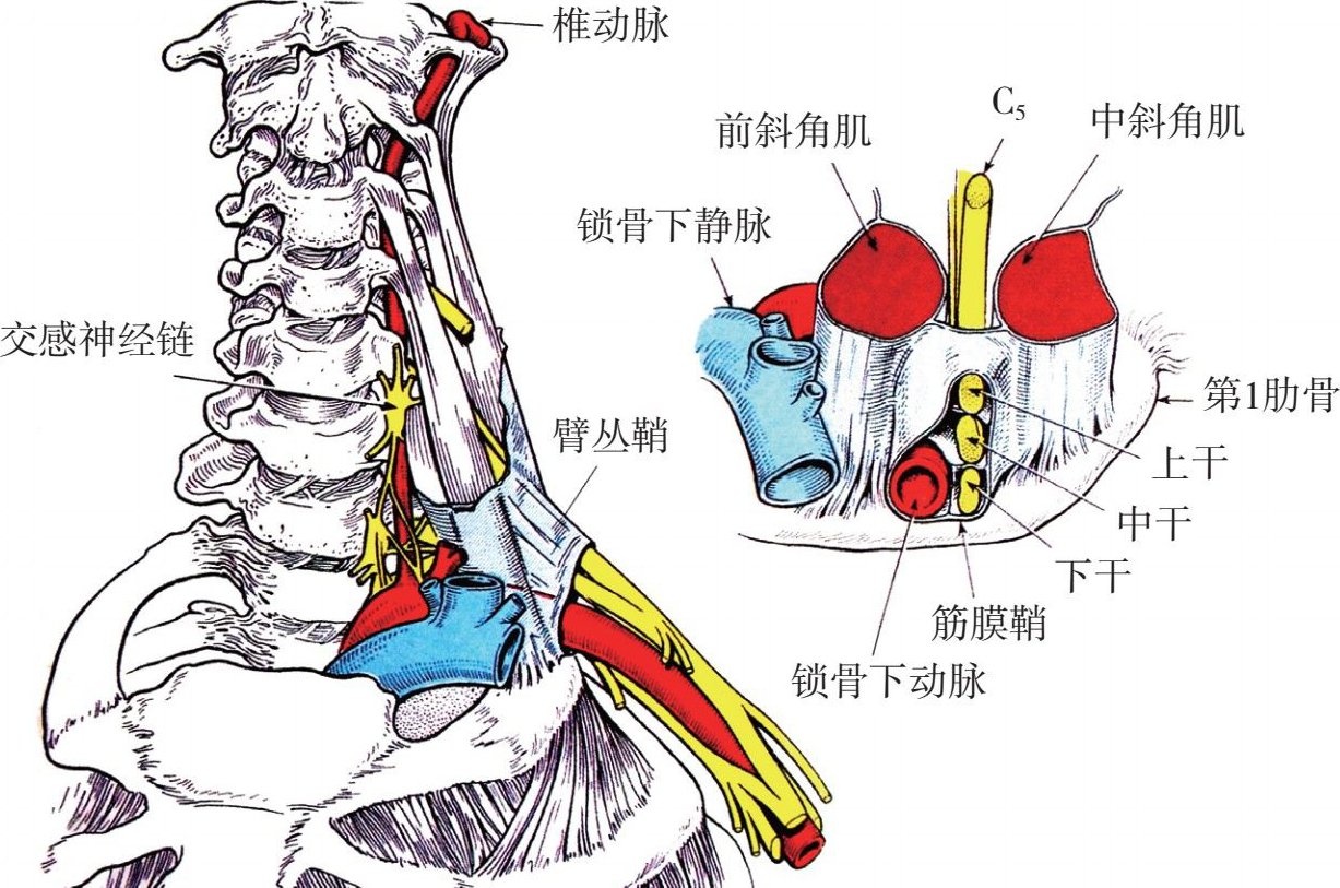 图3-6 颈脊神经根自斜角肌间沟内穿出,被肌筋膜所包绕,形成一囊腔。当麻醉药液注入该囊腔中时,将会产生浸润性阻滞作用