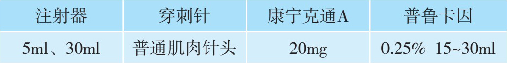 2.用药 包括试验药和治疗药:试验药为1%利多卡因3ml;治疗药共计12ml,其中包括:2%利多卡因3ml、曲安奈德1ml(40mg)或倍他米松1ml、生理盐水8ml。