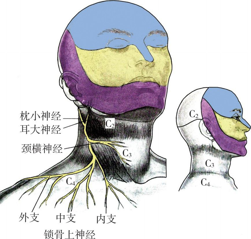 颈神经丛浅丛位于胸锁乳突肌后缘中点,从这点向前分出颈前神经(C 2 、C 3 ),向下分出锁骨上神经(C 3 、C 4 ),向后上分出耳大神经(C 2 、C 3 ),向后分出枕小神经(C 2 、C 3 ),颈浅丛呈披肩状分布于头颈胸肩的后部。颈深丛支配颈肌、膈肌,并与舌下神经、副神经、迷走神经以及交感神经干相连接。