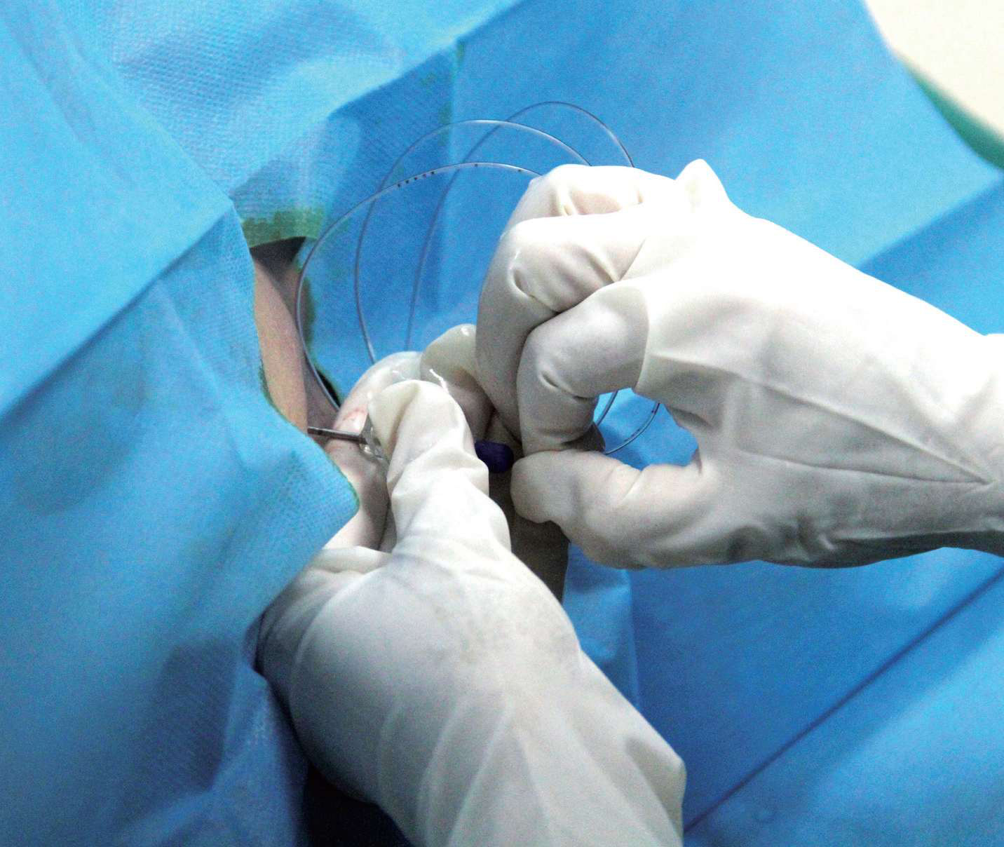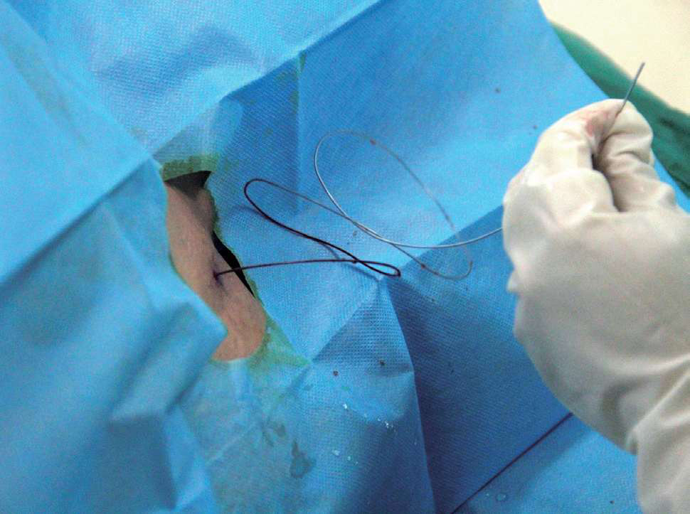 图3-30 保留硬膜外导管,拔出硬膜外穿刺针
