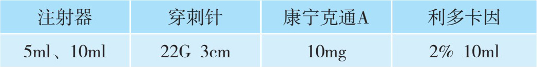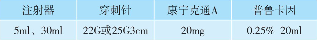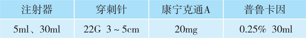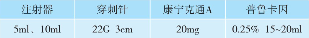 2.用药 包括试验药和治疗药:试验药为1%利多卡因3ml;治疗药共计12ml,其中包括:2%利多卡因3ml、曲安奈德1ml(40mg)或倍他米松1ml、生理盐水8ml。