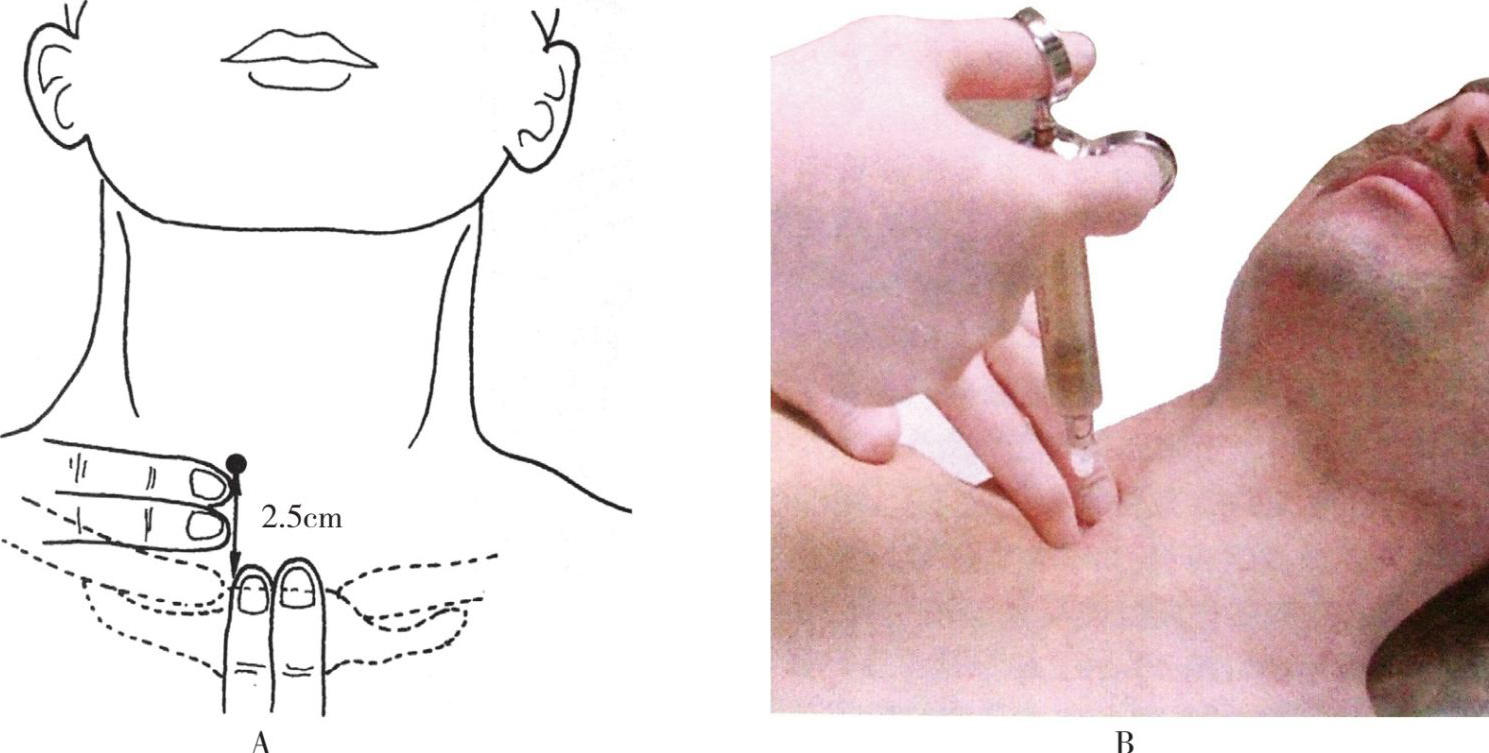 A. 右侧胸锁关节上2.5cm处为进针点。B. 术者用左手示、中二指深压触得第6颈椎横突前结节,用右手持注射器自示、中二指之间进针,向着第6颈椎横突前结节,直接穿刺注药。