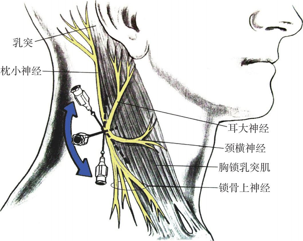 (2)颈浅丛注药:颈浅丛神经位于胸锁乳突肌的中点、后缘,进针不宜过深,只要将药液注入在胸锁乳突肌后缘中段的适合深度,就可产生阻滞作用,注药量可达10~20ml,沿胸锁乳突肌后缘中段注药即可(图3-20)。