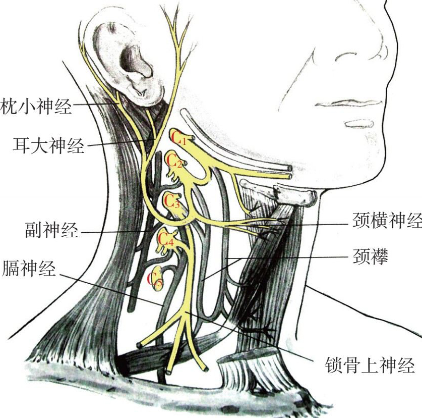 颈神经丛浅丛位于胸锁乳突肌后缘中点,从这点向前分出颈前神经(C 2 、C 3 ),向下分出锁骨上神经(C 3 、C 4 ),向后上分出耳大神经(C 2 、C 3 ),向后分出枕小神经(C 2 、C 3 ),颈浅丛呈披肩状分布于头颈胸肩的后部。颈深丛支配颈肌、膈肌,并与舌下神经、副神经、迷走神经以及交感神经干相连接。