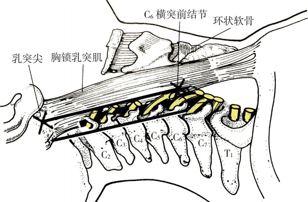 表面标志:在乳突尖端以下1.5cm为第2颈椎横突、第6颈椎横突最高即颈动脉结节容易定位,用手可以触到。从乳突至第6颈椎横突作一连线,在此连线上C 2 横突以下2cm为C 3 的横突,下3cm为C 4 横突,C 4 横突恰恰位于胸锁乳突肌与颈外静脉的交角以上的1.5cm处,用手指按压可触到横突并出现异感。