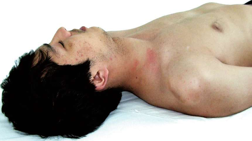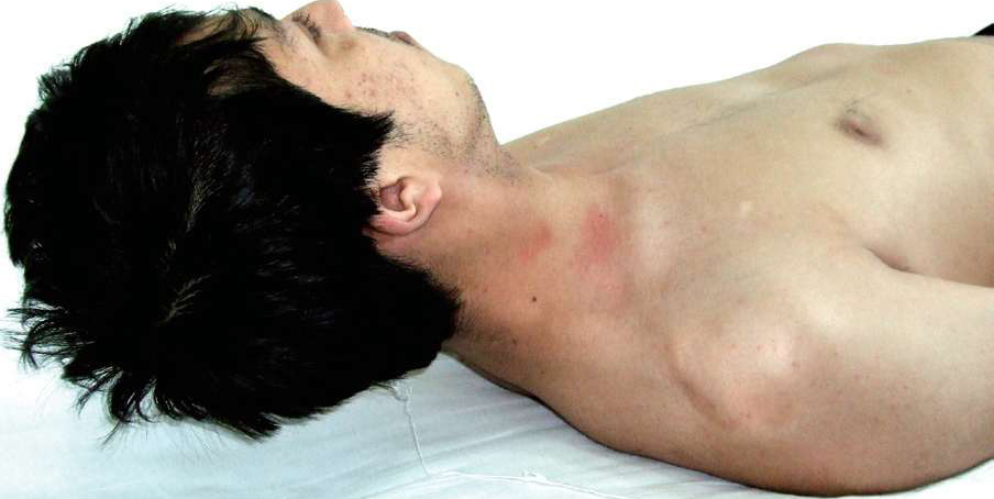 图3-9 将头抬起离床,可见胸锁乳突肌紧张成形