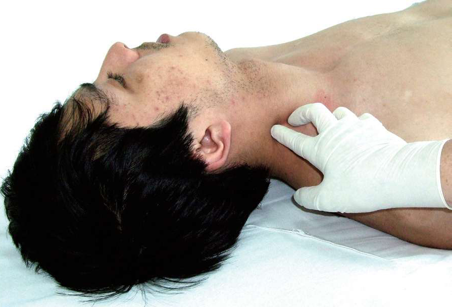 图3-10 术者将示指和中指放在胸锁乳突肌的后缘,插入胸锁乳突肌的深层