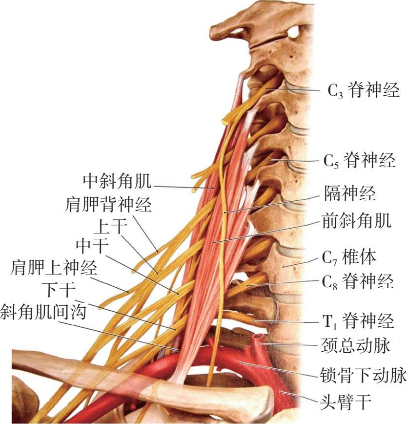 熟悉斜角肌间的解剖是穿刺成功的关键。颈部有两群肌肉,分内侧群(椎前群)和外侧群(斜角肌群),其中的前斜角肌起自第3至第6颈椎横突的前结节,肌纤维向外下方走行,止于第1肋骨内缘的斜角肌结节;中斜角肌位于前斜角肌的后方,起自第2至第7颈椎横突的后结节,肌纤维向外下方止于第1肋骨上。脊神经根从椎间孔穿出后,经前后结节之间,穿行于前、中斜角肌间隙形成臂丛神经。斜角肌间沟的内缘为颈椎,前后缘为斜角肌,底部为第1肋骨(图3-5至图3-7)。
