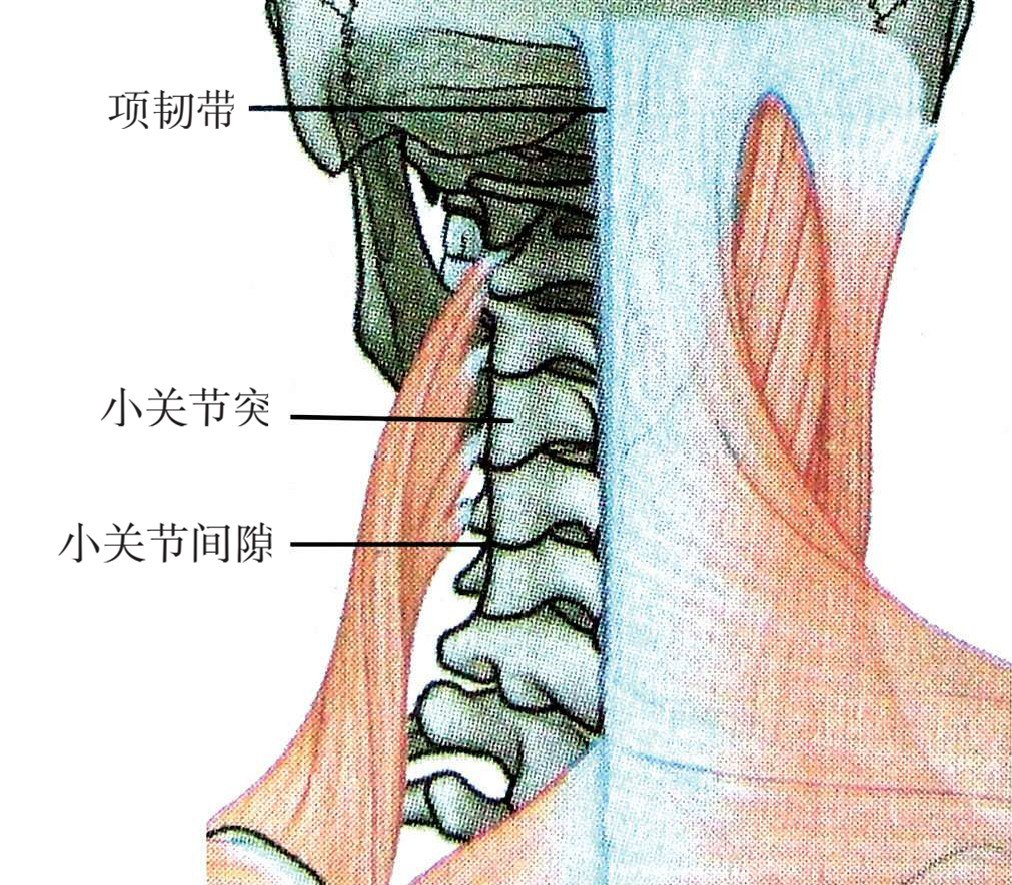 颈椎小关节非常平滑,关节间隙与垂直面呈30°~45°。颈椎小关节突旁开棘突为1.5~2cm,瘦人隔着皮肤可以触得,感觉像平坦的柱状(图3-2),受累关节对压力很敏感。可因小关节间隙的滑膜炎或滑膜嵌顿,而致急性疼痛,被认为是“落枕”。