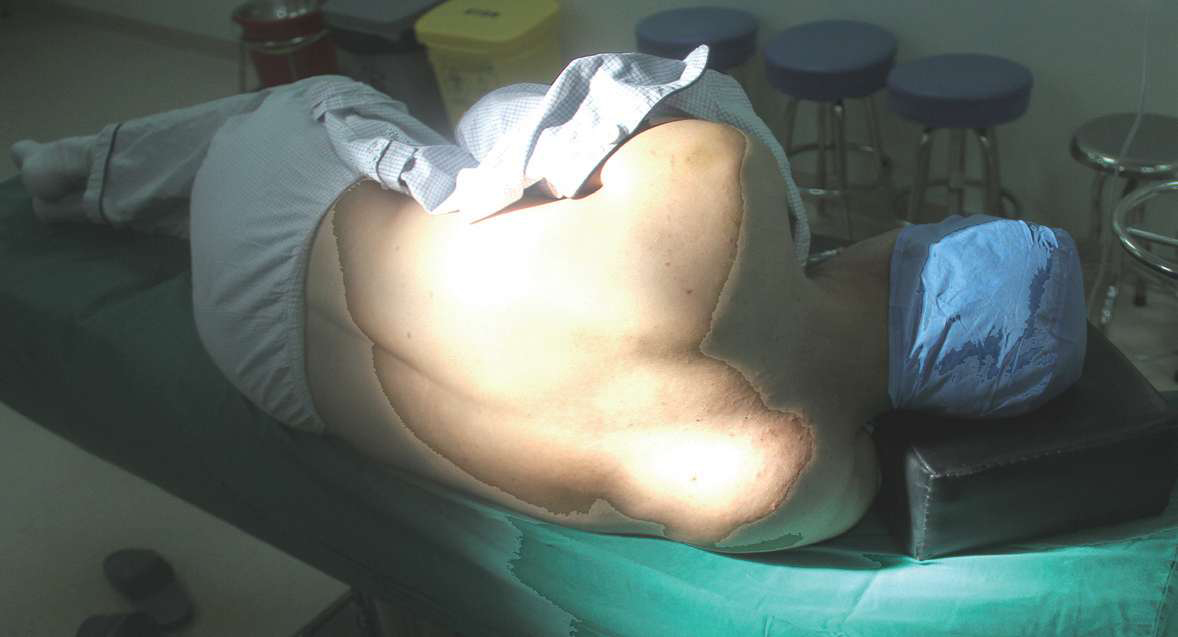 (2)消毒铺巾:以穿刺点为中心进行局部消毒,上至发际线,下至肩胛下角,两侧至腋后线,铺无菌孔巾。