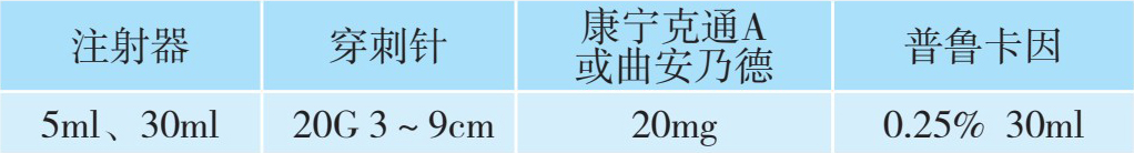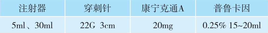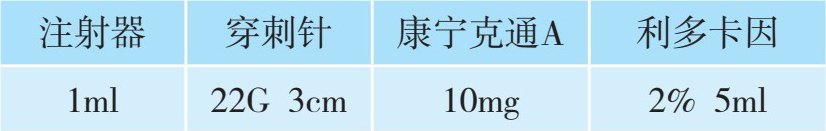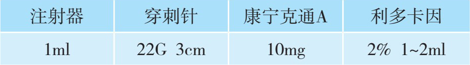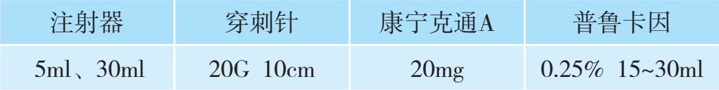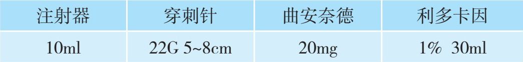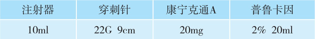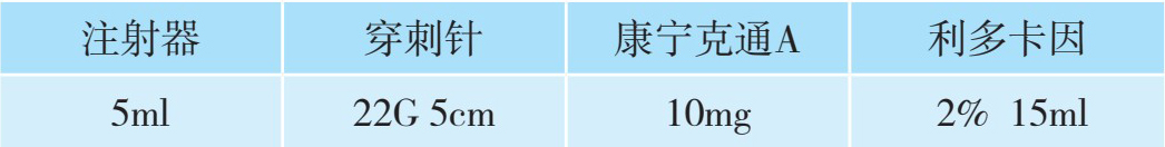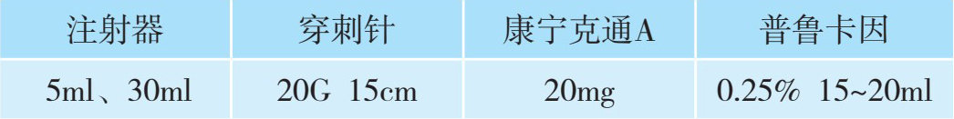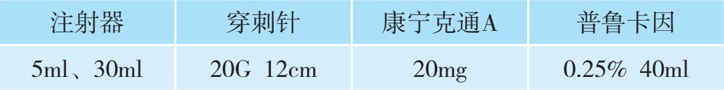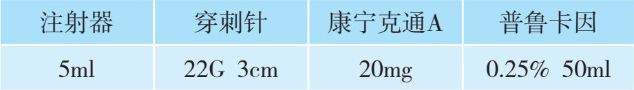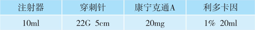 硬膜外穿刺包。用药包括试验药和治疗药:试验药为2%利多卡因4ml;治疗药共计20ml,其中包括:2%利多卡因5ml、曲安奈德1ml(40mg)或倍他米松1ml、生理盐水14ml。