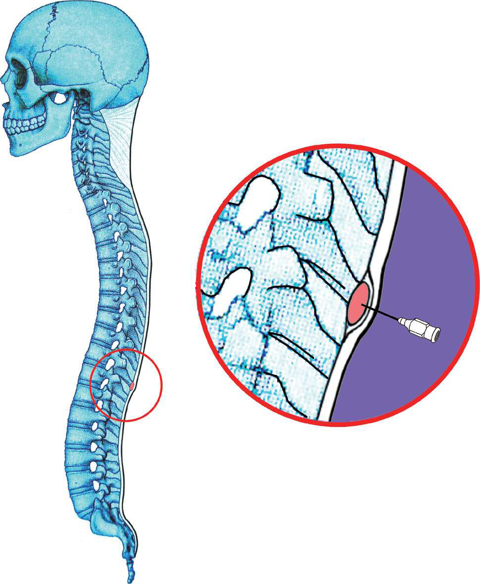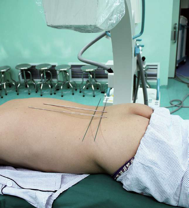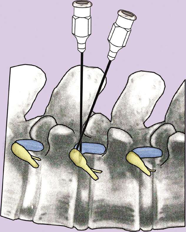 (5)注药:刺穿正确后,拔出针芯,穿刺针尾连接注射器,将事先配好的药液,按每个脊神经背内侧支5ml给药(图4-58)。给药过程中,患者会出现局部胀痛,为正常现象。除向靶点给药外,还可轻微移动穿刺针,向临近的小关节囊表面给予药物。注药后,取下注射器,将针芯归于穿刺针内,缓慢拔出穿刺针,并以敷料包扎。