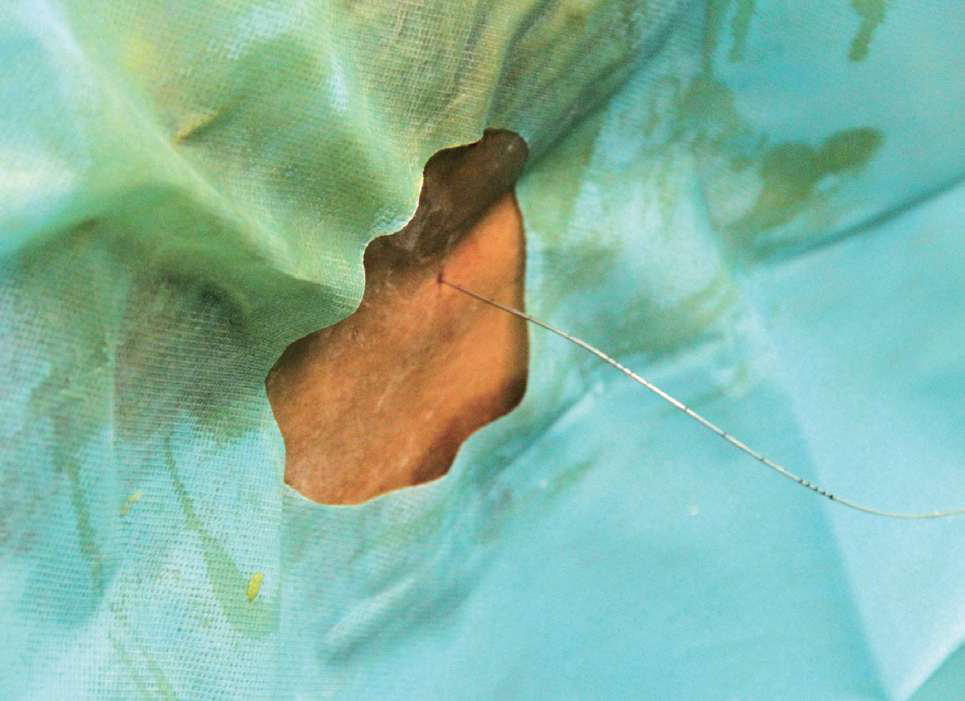 (5)置管:证实穿刺针置入硬膜外间隙后,经穿刺针置入硬膜外导管(图4-62)。置管的方向和深度根据病患的部位决定,通常向尾端置管,置管深度达到病患间隙位置为准。然后保留固定硬膜外导管,拔出硬膜外穿刺针(图4-63),将硬膜外导管固定于体表(图4-64)。