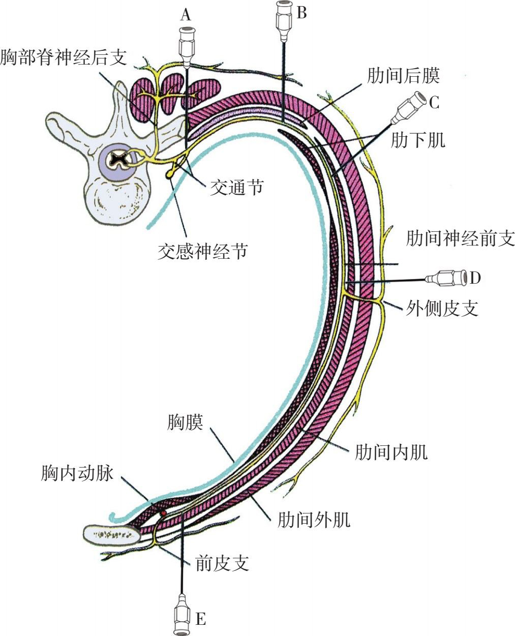 (1)肋角处:后正中线旁7~8cm,相当于骶棘肌外缘。在侧方肋间内膜变为肋间内肌。在肋角处肋骨和肋间隙较宽,一般不会穿透胸膜,在这里穿刺较容易。其缺点是不能阻滞胸神经后支及交感神经交通支。只有椎旁胸神经阻滞术才能对这两条神经产生阻滞作用。