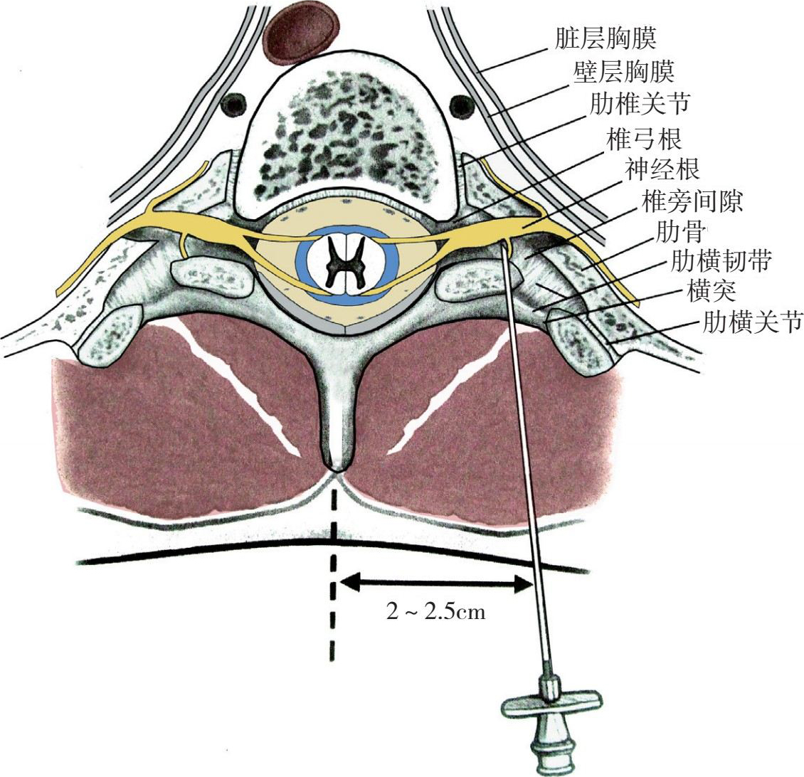 3.具体操作 给患者摆好体位,确认背部中线。确定拟阻滞的胸神经节段,在所定节段对应的脊突上缘距离中线2~2.5cm处分别做标记(图4-13)。切记进针部位的选择一定不要距离中线过远,以免穿刺针刺入胸膜腔。穿刺部位皮肤用适当的消毒液进行准备。皮肤和皮下组织的局部麻醉使用1%利多卡因溶液。22G的硬膜外穿刺针连接于注射器,向前方横突方向进针。对于许多患者,在进针3~5cm时可以碰到横突。碰到横突后,标记深度,然后拔出穿刺针,重新略向下、向前进针,进针深度碰到横突后再向前进针1cm。穿刺针杆上标记1cm刻度有助于穿刺不会过深。为了避免穿刺进入胸膜腔,一定要注意穿刺深度不能超过碰到横突后的1~1.5cm(图4-14)。穿刺针进入椎旁间隙应当有典型的“阻力消失”感觉。回吸试验应当阴性,而注射应当容易。每一阻滞节段注射5ml局麻药液。在进针过程中如果发生异感,注射前需要略微调整针的位置。