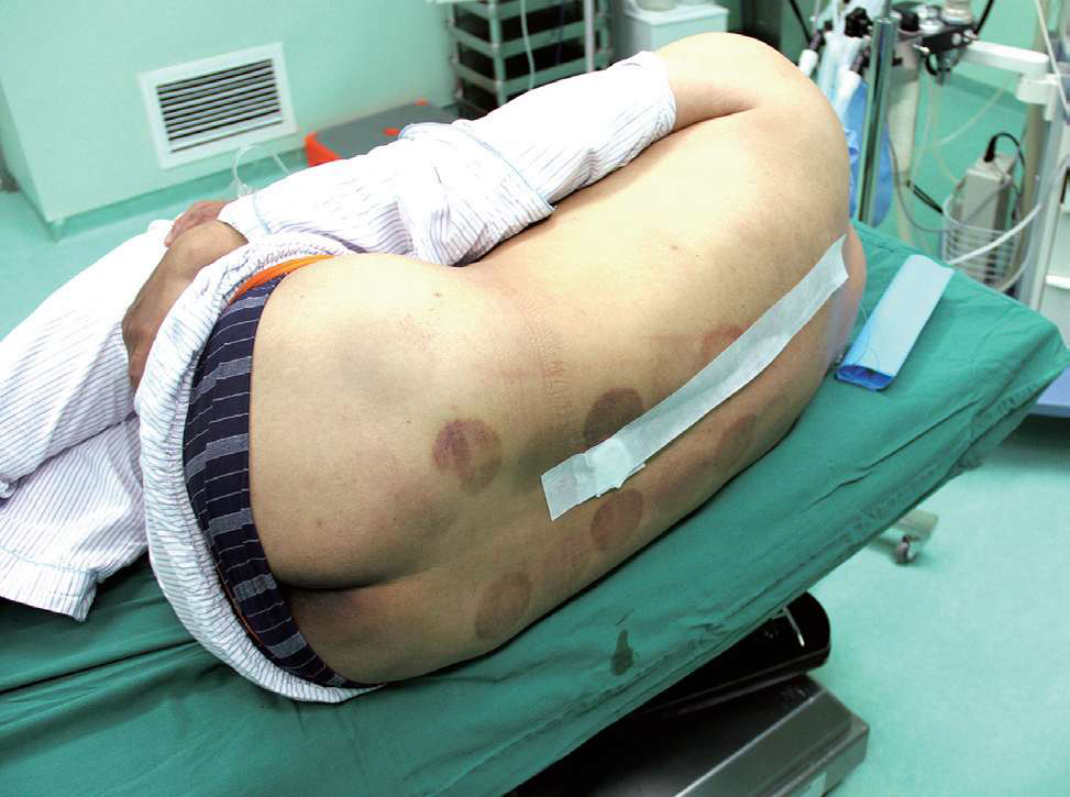 (2)消毒铺巾:以穿刺点为中心进行局部消毒,上至肩胛下角,下至尾椎,两侧至腋后线,铺无菌孔巾。