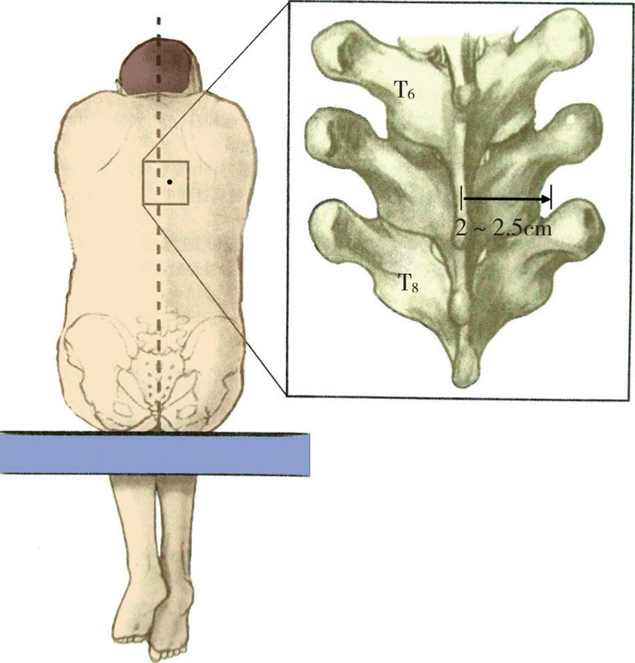 图4-13 胸脊神经根穿刺体位及穿刺点
