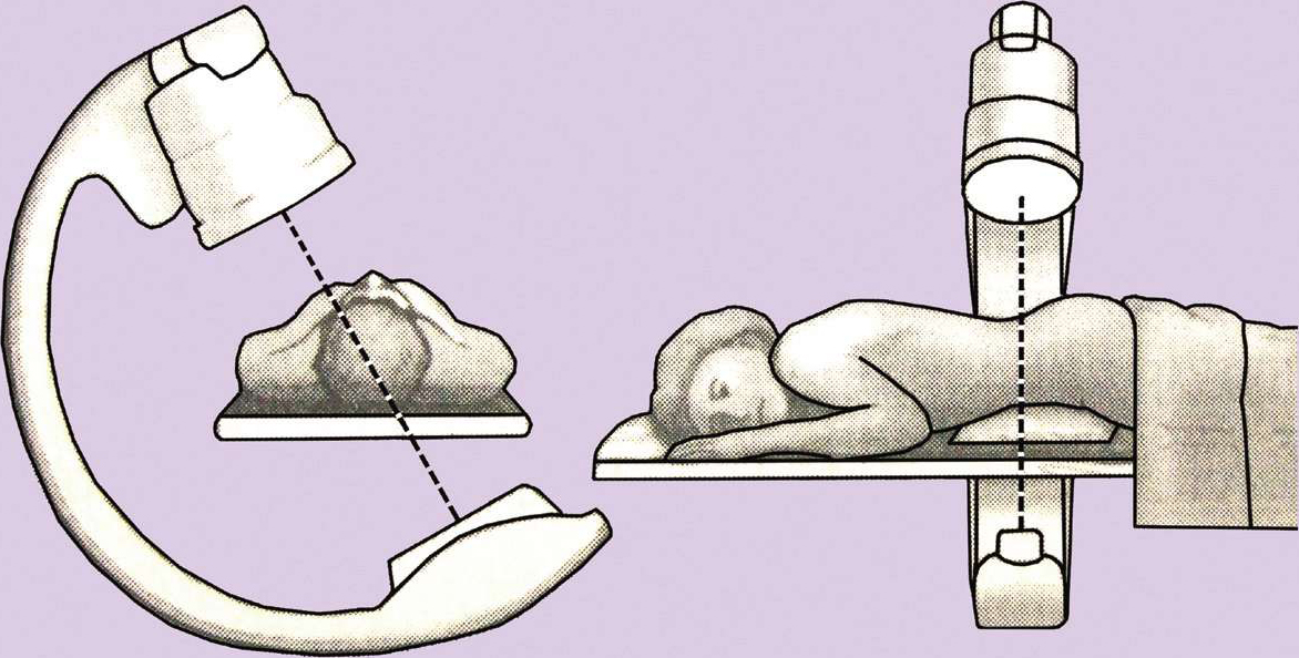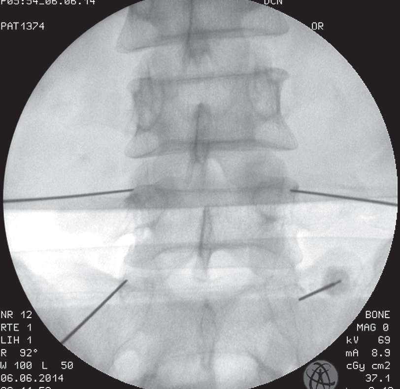 2.体位 患者应采取俯卧位,卧于可透X线的手术床上,胸下髂下垫软垫,可通过调节手术床,将腰椎调整至轻度后凸位(图4-52)。