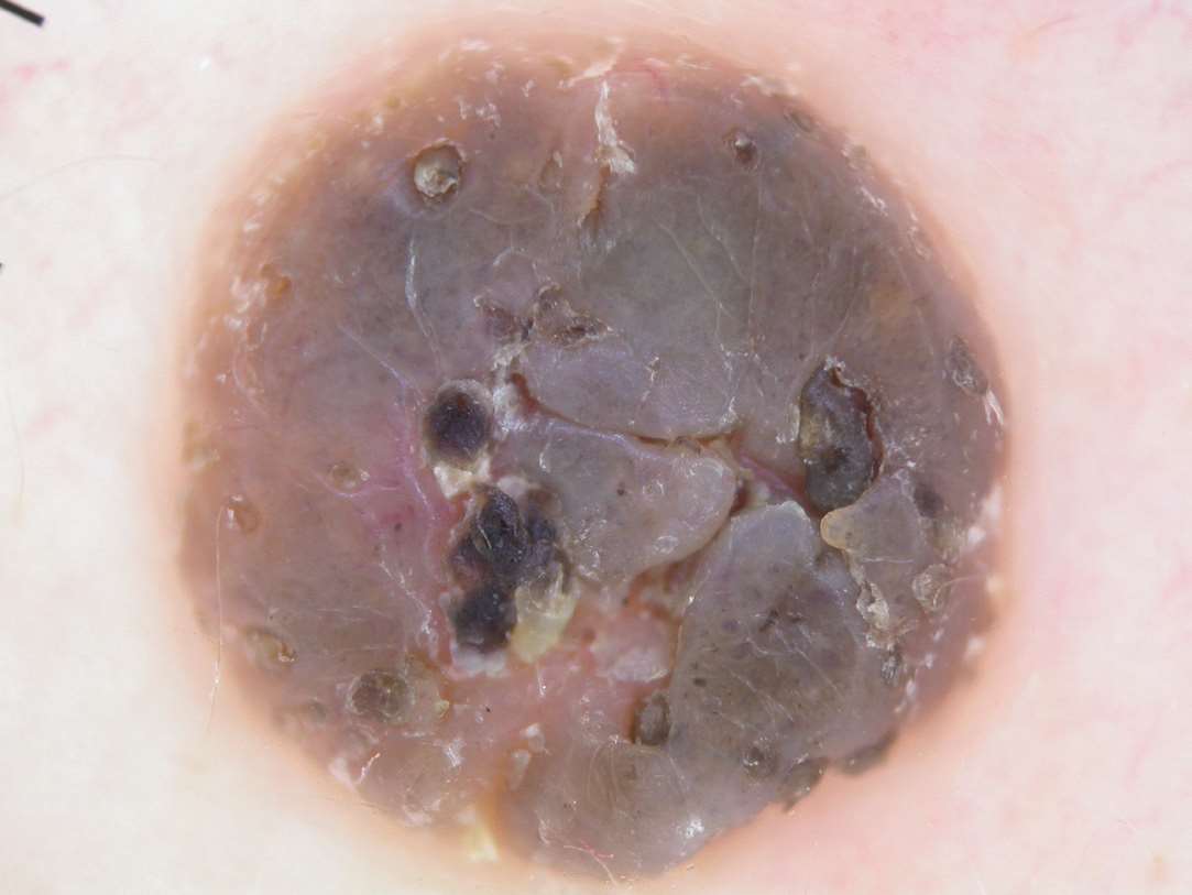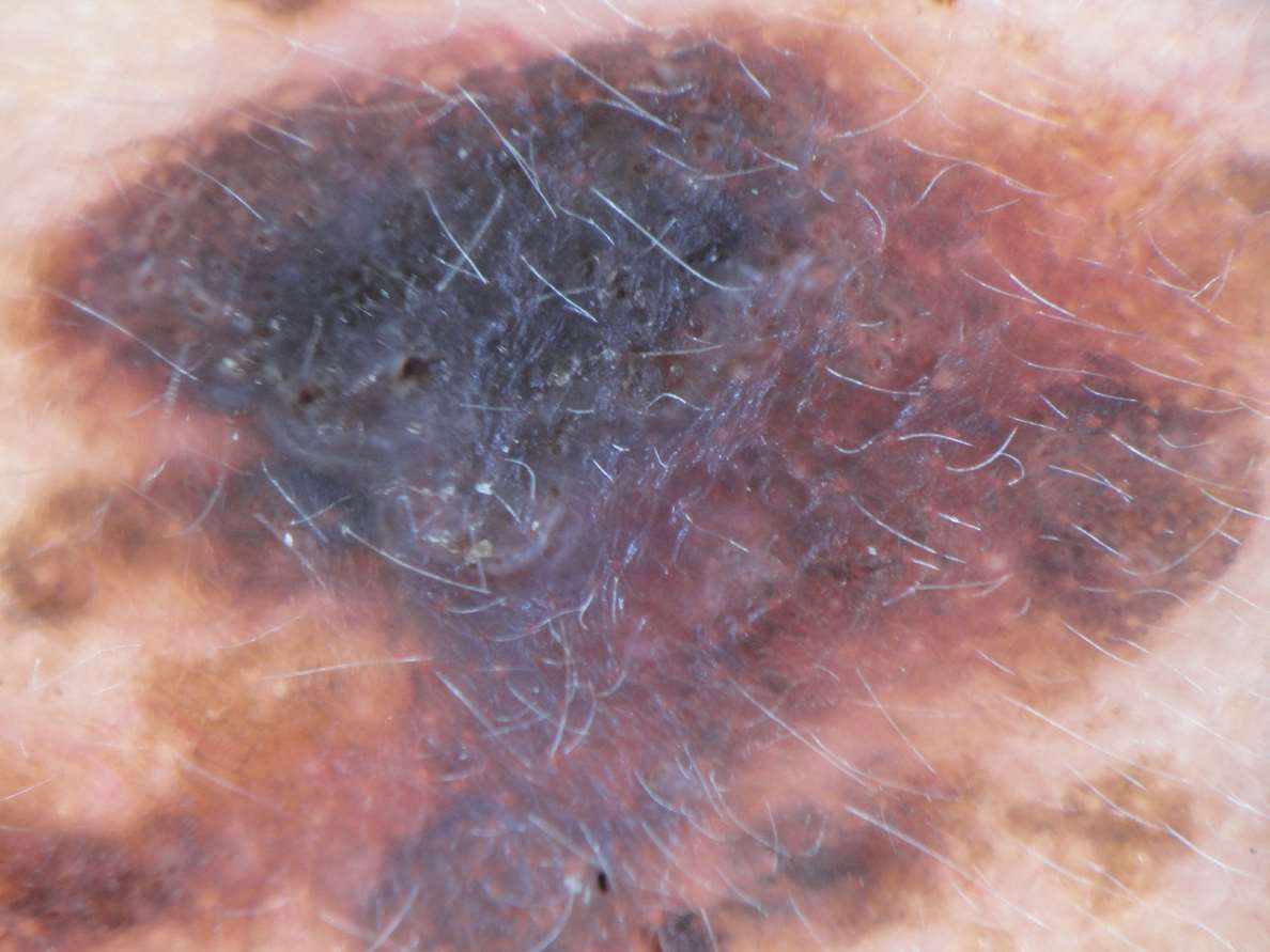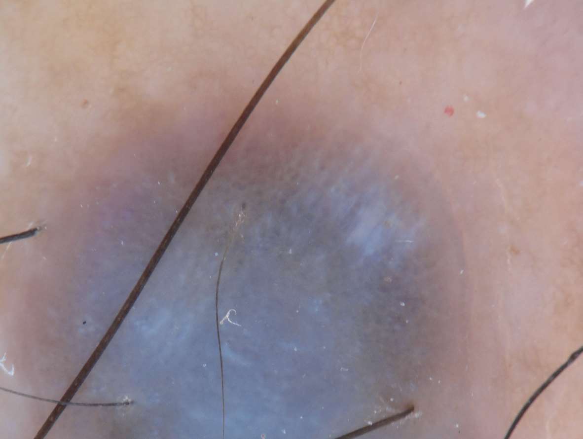 图1-6 恶性黑素瘤患者肢端皮损的皮肤镜下蓝白幕征象