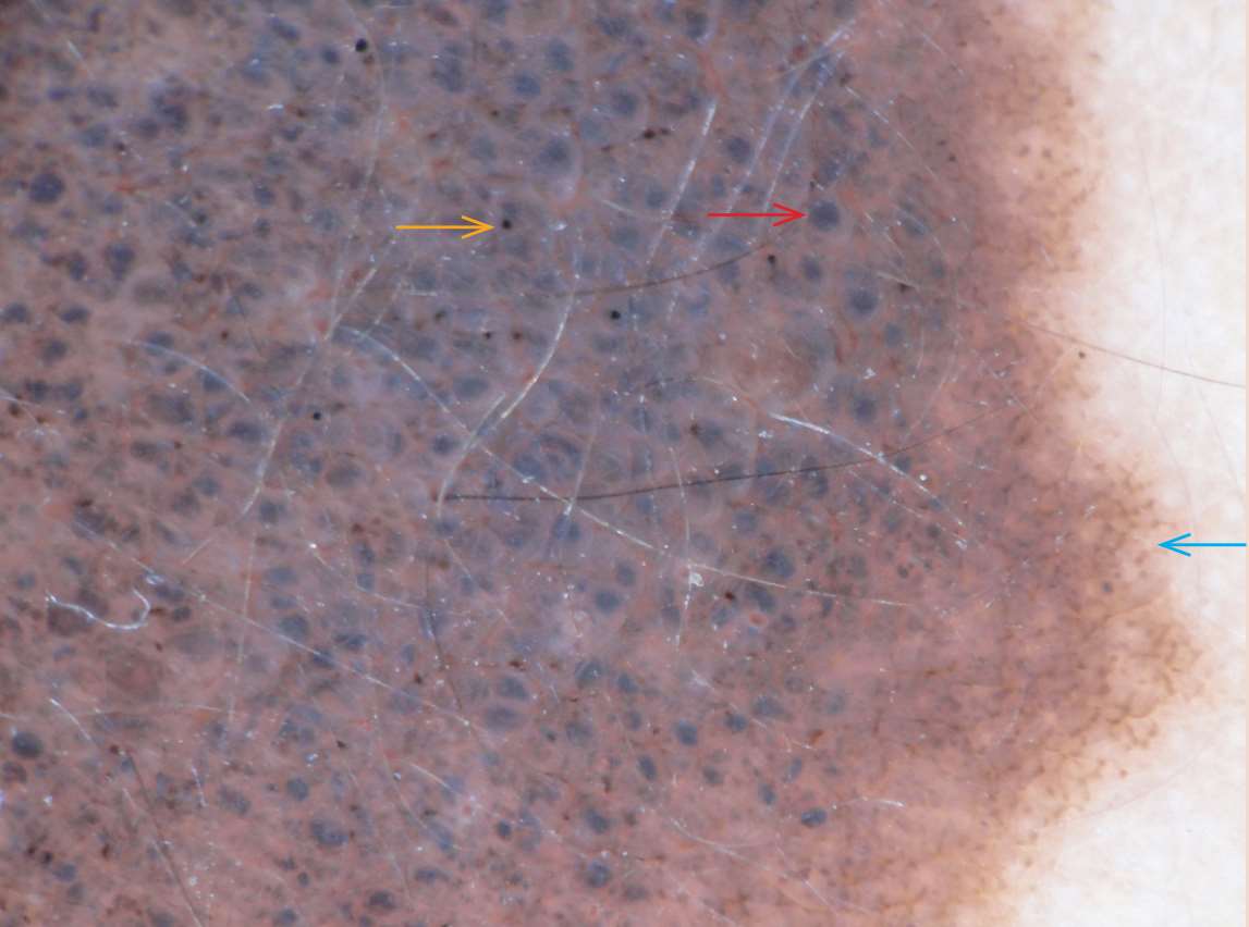 良性和恶性黑素细胞增殖均可以见到点状和球状结构,良性皮损中点状和球状结构的形态和大小均匀一致,常位于皮损的中央;恶性黑素瘤中这些结构形态和大小往往多变,而且常位于皮损的边缘。紧密聚集的有棱角或近方形的小球,类似鹅卵石样,又称为鹅卵石样模式(cobblestone pattern),常见于先天性色素痣。