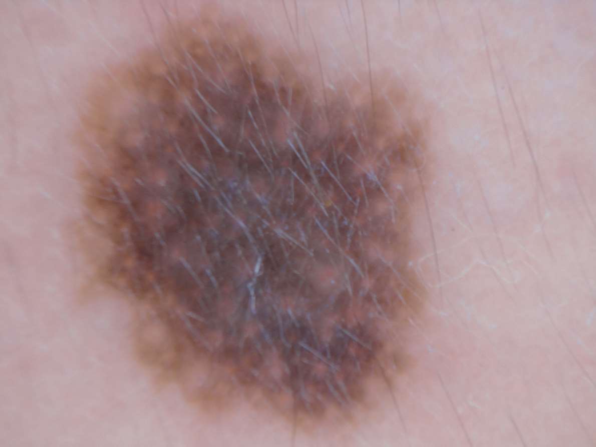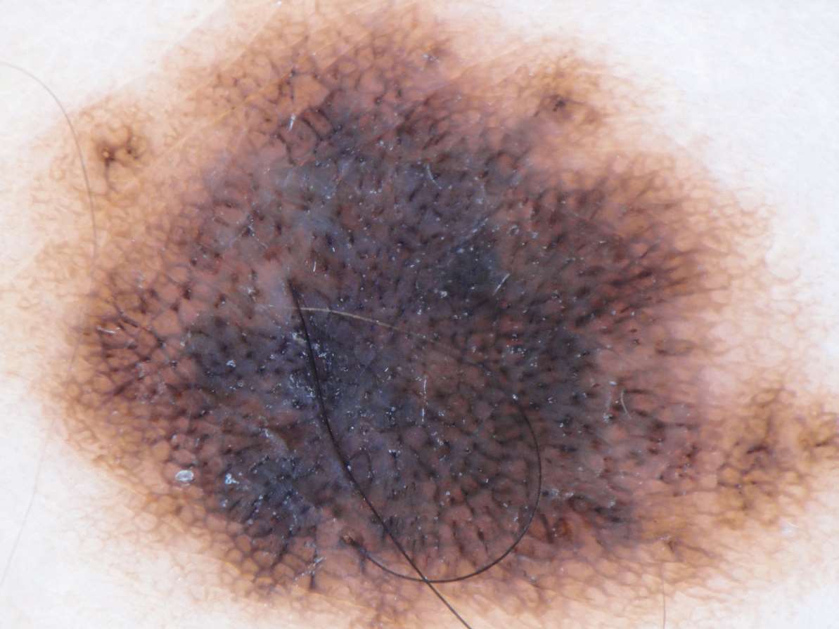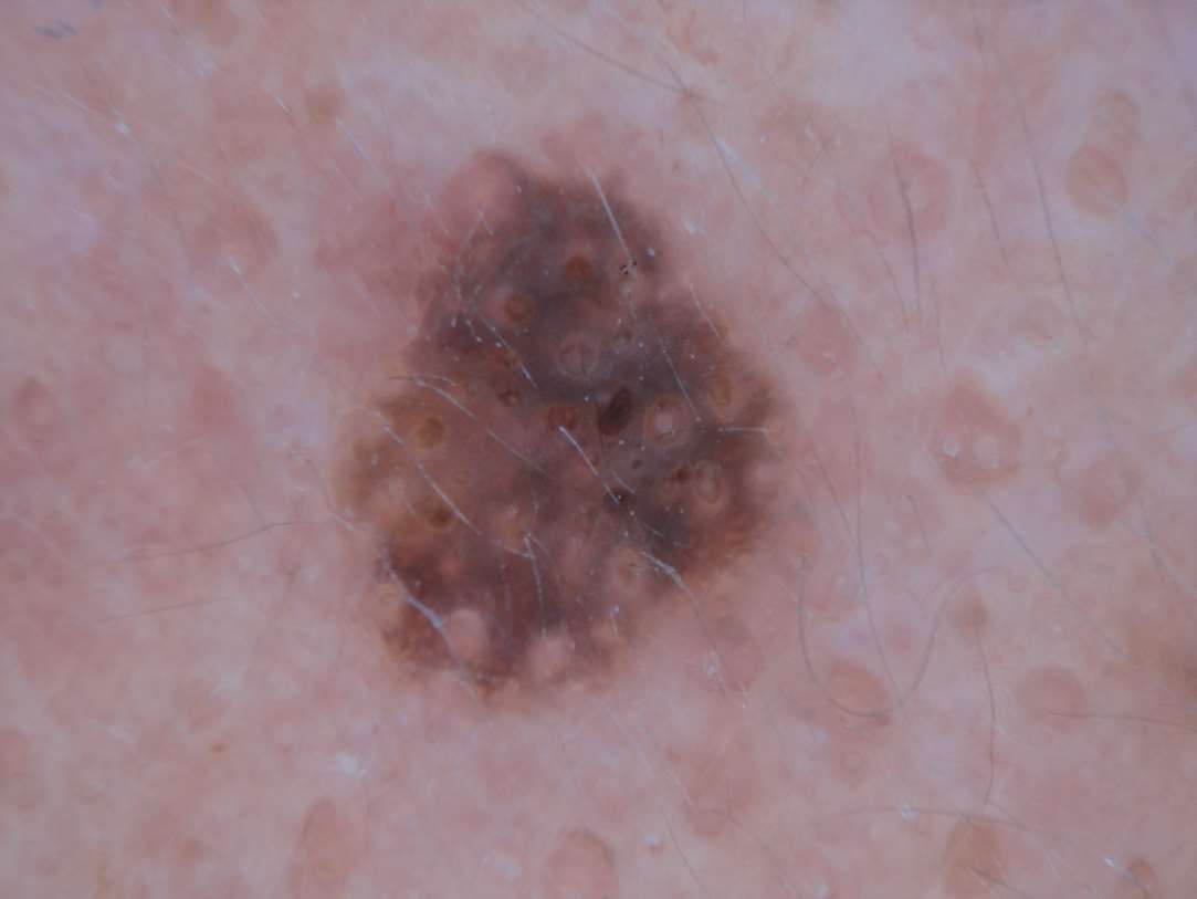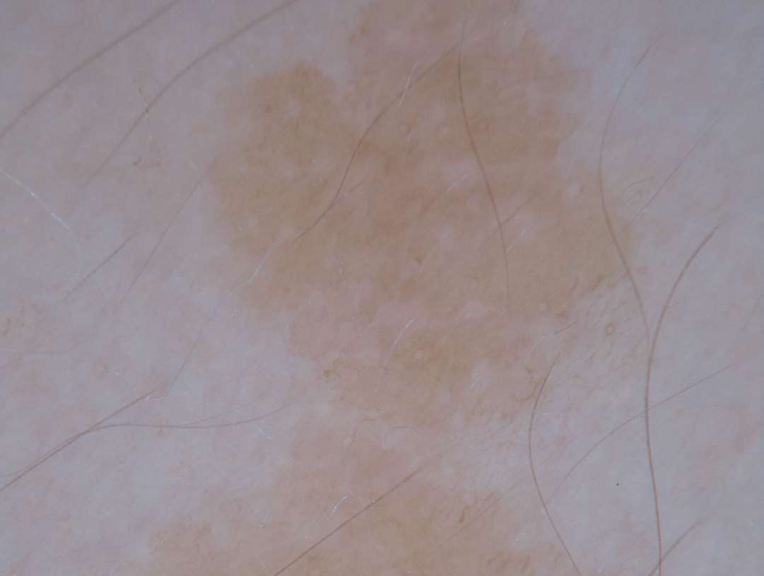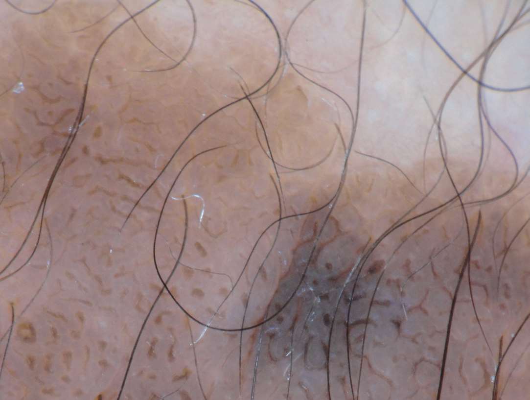 图1-2 面部色素痣中的假网状结构,可见圆形浅色网孔,网格线粗,与色素网的细线状网格线不同