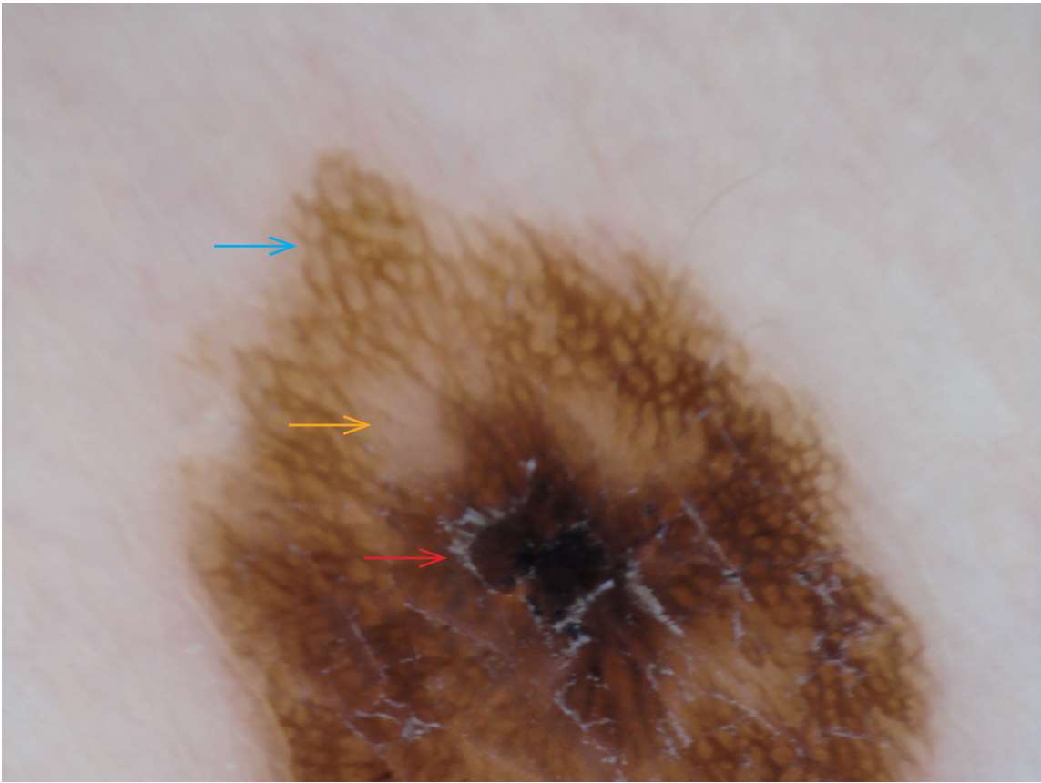 分枝条纹(branched streaks)是指断裂的色素网状结构,是色素网破坏后的残留结构(图1-3),组织学上对应于表皮嵴残留的色素和真皮乳头内的黑素细胞桥接巢。