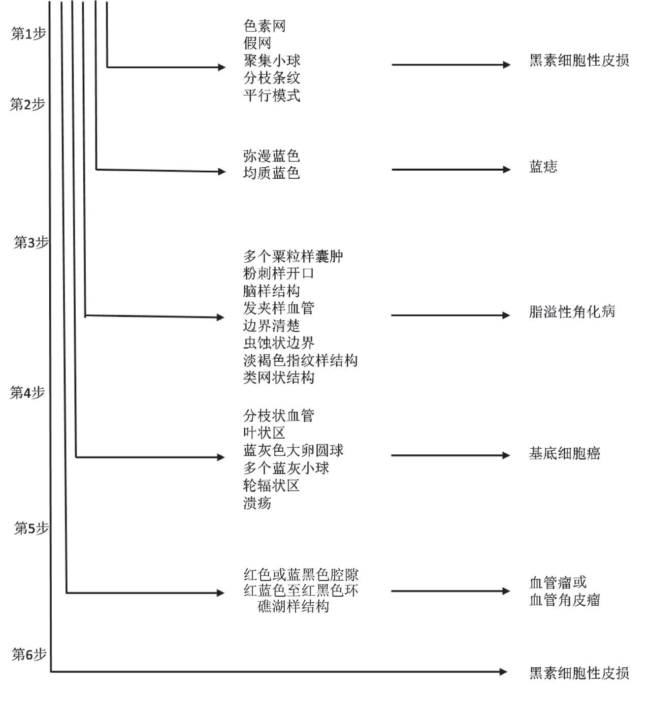 第一步鉴别黑素细胞性皮损和非黑素细胞性皮损,包括6个步骤(图1-12):①是否有色素网、假网状结构、聚集的小球、分枝状条纹、平行模式(掌跖、黏膜),如果有其中之一提示黑素细胞性皮损;②是否呈弥漫性蓝色、均一蓝色色素,如果有提示为蓝痣;③是否有多个粟粒样囊肿、粉刺样开口、浅褐色指纹样结构、脑样结构(裂隙和嵴)、发夹状血管、虫蚀样边界、类网状结构,如果有其中之一提示脂溢性角化病;④是否有分枝状血管、叶状区、蓝灰色大卵圆球、多个蓝灰小球、轮辐状区、溃疡,如果有其中之一提示基底细胞癌;⑤是否呈红色或蓝黑色腔隙、红蓝色至红黑色环礁湖样结构,如果有提示血管瘤或血管角皮瘤;⑥如果无上述5步中提到的皮肤镜特征,提示为黑素细胞来源的皮损。