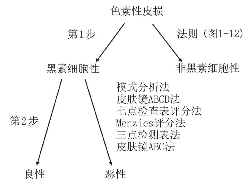 目前常用二步法(图1-11)对色素性皮损进行分类 [1] 。第一步判断皮损是否为黑素细胞来源;第二步判断黑素细胞来源的皮损是良性、可疑恶性或是恶性。