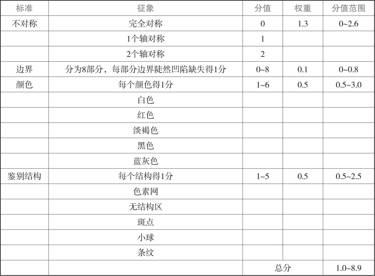皮肤镜ABC法(表1-5)是由Andreas Blum等 [14] 在2003年为了简化和提高皮肤色素性皮损诊断的正确率而创立,包括非对称性、边界、颜色、结构的鉴别、近3个月皮损的演变(与ABCD法则的不同之处),其中鉴别结构包括色素网、均质区、条纹、小球、黑点。总评分<4提示良性黑素细胞皮损,≥4提示皮肤黑素瘤。