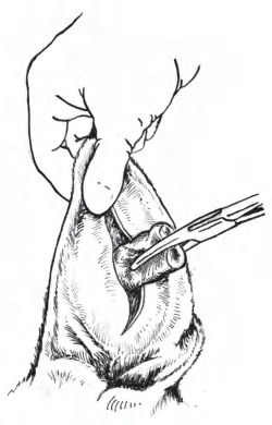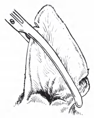 (5)用带有弧度的专门的断耳钳或断耳夹,自标记处至耳屏间切迹处分别装置在两耳上。调整、展平耳郭。在调整时要注意两耳郭在钳(夹)的后方余出的部分是否相同,这关系到截除这部分后两耳的形状和大小是否一致(图1-2-11)。