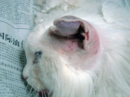 图1-2-1 猫外耳道感染耳痒螨而搔抓耳朵,发生耳血肿
