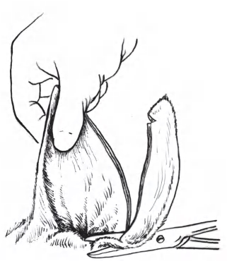 (3)在确定断耳要保留的长度后,将两耳提起,耳尖对齐,在需要保留的长度处用直针穿透两耳固定,以确保两耳的长度标记一致。然后用手术剪在此处剪一小口。此处即为断耳后的耳尖端(图1-2-9)。