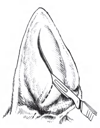 (2)截除耳郭的操作,要使用锋利的外科刀或剃须刀进行切割,这样切割的创缘整齐,愈合后美观。使用其他器械切割,或许创缘呈锯齿状,将来愈合后耳郭缘会不齐整,影响美观。