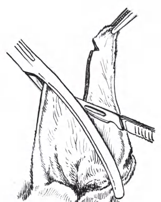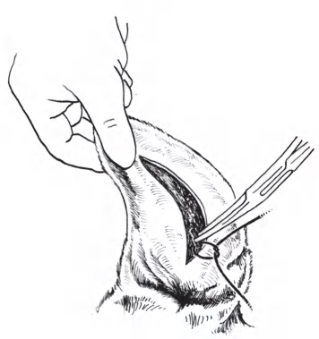 图1-2-13 用手术剪沿切口剪至耳屏,截断耳郭