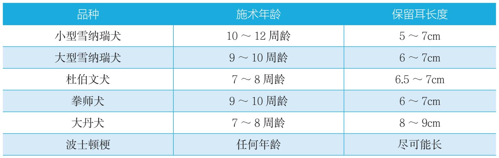 需要施术的犬种因品种不同,施术时的年龄要求不同,施术时耳的保留长度也不同。一般施术年龄与耳长度要求如表1所示。在允许的年龄段内,越早施行手术,成功的把握越大。