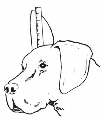(2)施术前,需要测量耳的长(高)度。测量从耳郭中央与头部连接处到耳尖的距离(图1-2-8)。测量完耳的长度后,对术后需保留的长度及形状进行测量和预计,并与头进行目测、比较。一般来讲,犬的年龄小,耳保留得稍长,反之稍短;公犬保留稍长,母犬稍短。耳整修后呈喇叭状或“马刀”状。