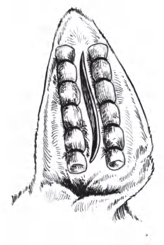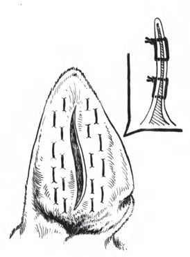 图1-2-7 平行皮肤切口,作两个纱布棉垫压迫缝合