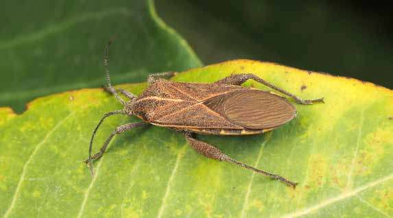 形态特征 │ 成虫: 体长 17~21 mm,体形较窄长,黄色,被黄褐色细硬短毛;前胸背板及后足腿节有深褐色斑纹;头、前胸背板、腹部腹面、足为淡赭黄色;腹部背面红色;触角黑褐色,基节色稍浅。前胸背板后缘向外圆弧形弯曲,侧角不突出。小盾片基部有一深褐色半圆形纹斑。前翅革片在脉间有棕色斑,爪片色深;膜片棕黑色,达于腹末端;侧接缘无斑纹。腹下胸侧板、后胸侧板及各节腹板散生黑色瘤点。气门周围黑色。