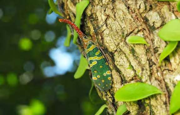 形态特征 │ 成虫: 体长 37~42 mm,体色艳丽,头背微带绿色。头额延伸如长鼻,额突背面红褐色,腹面黄色,散布许多白点。胸部红褐色,有零星小白点;前胸背板具中脊,中域有 2 个明显的凹斑,两侧前沿略呈黑色;中胸背板色较深,有 3 条纵脊。前翅绿色,外半部约有 14 个圆形黄斑,翅基部有 1 条黄赭色横带,近 1/3 至中部处有 2 条交叉的黄赭色横带,有时中断;这些圆斑和横带的边缘常围有白色蜡粉。后翅橙黄色,顶角黑褐色。腹部背面橘黄色,腹面黑褐色,被有蜡质白粉,各节后缘为黄色狭带,腹末肛管黑褐色。