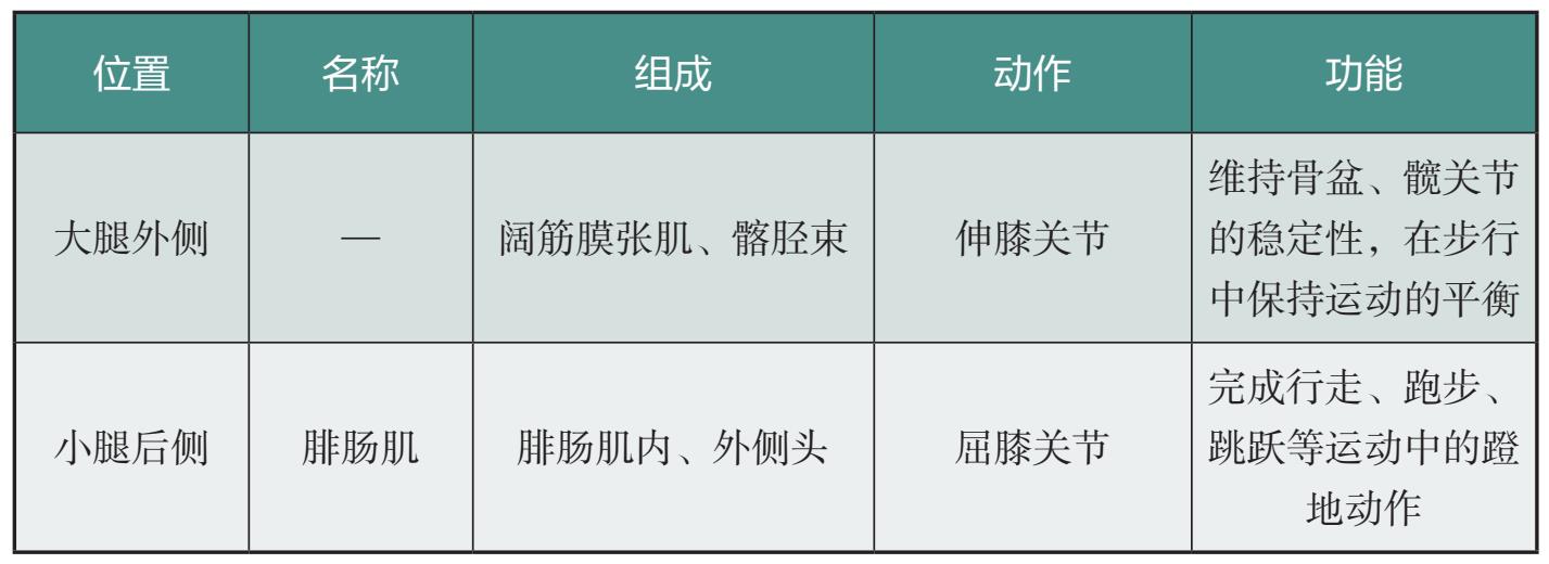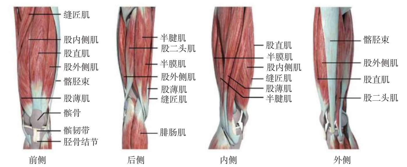 膝关节周围的肌肉包括 大腿前侧、后侧、内侧、外侧 及 小腿后侧 的肌肉(图1-13)。这些肌肉的位置、名称、组成、完成的动作、功能见表1-1。肌肉质量和功能水平与膝骨关节炎的发生、发展及症状缓解有密切关系。