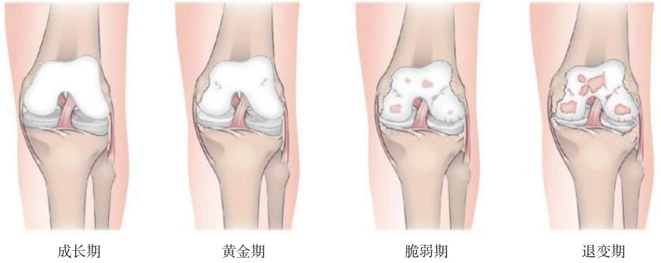 阶段三: 脆弱期,30~45岁,膝关节软骨产生早期轻度磨损,酸痛的频率增加,膝关节步入脆弱期。