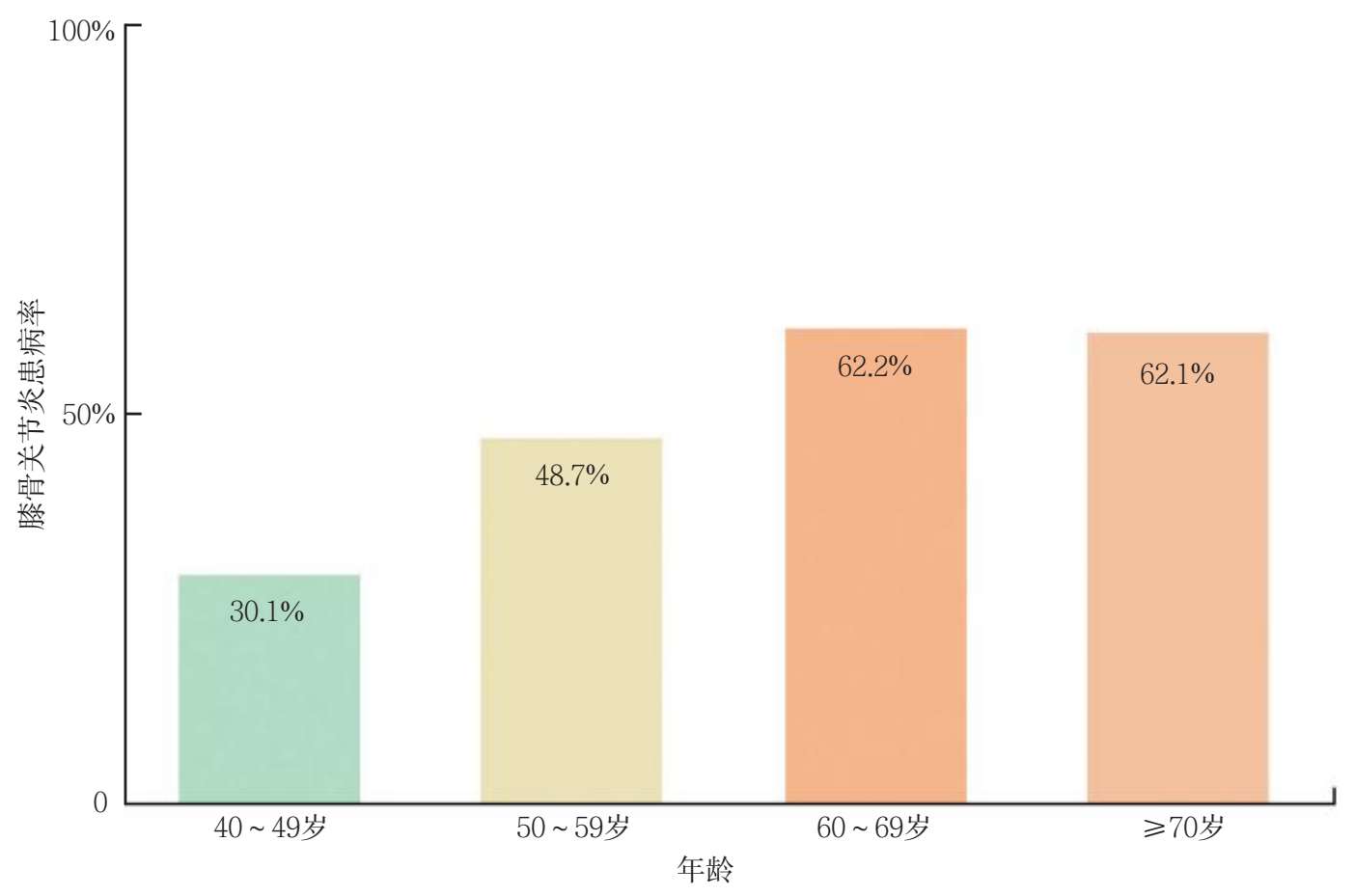 随着年龄的增长,膝骨关节炎的患病率也呈上升趋势。 据报道,我国40岁及以上人群原发性膝骨关节炎的总体患病率为46.3%,当中不同年龄段人群的膝骨关节炎患病率见图2-2。越来越多的中老年人患上膝骨关节炎,因为膝关节疼痛和功能障碍,严重影响了晚年生活质量,给个人、家庭和社会带来巨大的疾病负担。