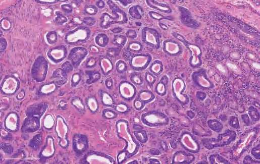【镜下形态】肿瘤由小的立方形细胞组成,胞质少,细胞核深染,核分裂象少见,常可见周围神经浸润。具有筛状、管状和实性三种组织学结构。最常见的是筛状结构,其特征是肿瘤细胞巢被嗜碱性基质围成多个假腺腔。当形成具有两层细胞的管状结构时,腔内细胞呈立方形,外周包绕肌上皮层(图2-16)。实性结构由肿瘤细胞巢构成。免疫组织化学显示上皮和肌上皮表型,包括CK、波形蛋白、肌动蛋白、S100蛋白等。
