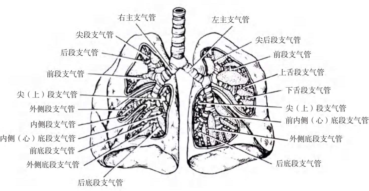 肺门处左、右主支气管分出次级支气管,进入肺叶,称为肺叶支气管。肺叶支气管进入肺叶后,分出再次级支气管,称为肺段支气管(图1-2)。各级支气管反复分支形成树状,称为支气管树。其中左肺分为上叶支气管和下叶支气管,右肺分为上叶支气管、中叶支气管和下叶支气管。临床上,从支气管(第1级)至肺泡(第24级)约有24级分支,管径≤2 mm的支气管称为小气道。小气道为膜性气道,管壁无软骨支持。