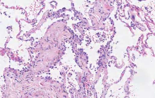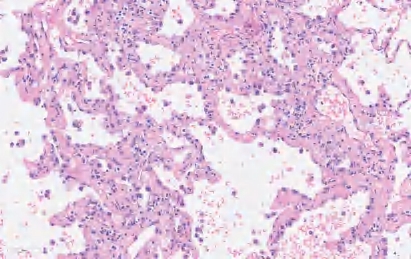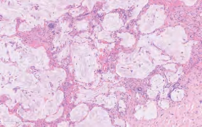 胶样腺癌是一种侵袭性腺癌,表现为广泛的细胞外黏液池扩张,致使肺泡腔扩张并破坏肺泡壁和肺泡腔。
