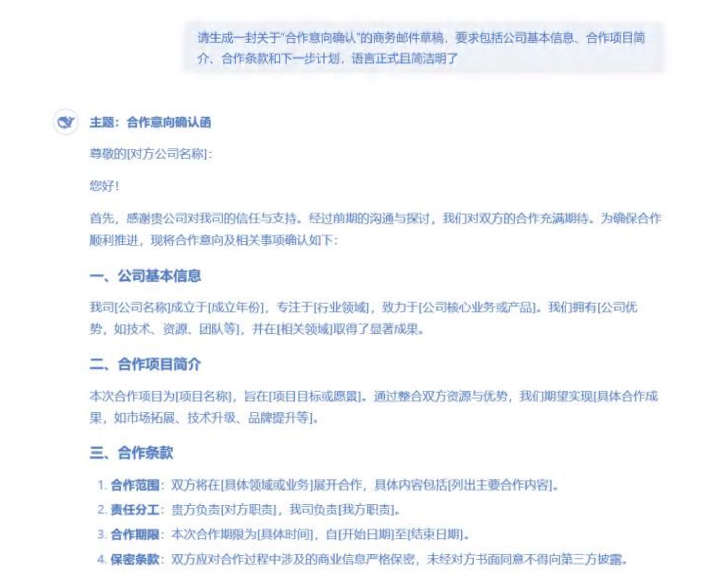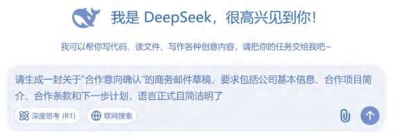 ● 用户在DeepSeek输入框中输入指令:“请生成一封关于‘合作意向确认’的商务邮件草稿,要求包括公司基本信息、合作项目简介、合作条款和下一步计划,语言正式且简洁明了。”